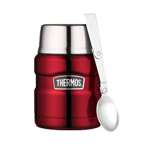 • The Thermos King Vacuum Insulated Food Jar (470ml) is a sturdy, stainless steel container perfect for transporting hot or cold meals to work, school, or out and about.