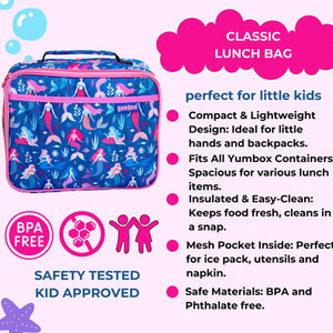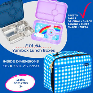 Yumbox Classic Lunch Bag is an insulated, water resistant insulated bag with padded handle and fun designs, designed to fit all Yumbox sizes - including the Yumbox Tapas, Yumbox Original, Yumbox Panino, Yumbox Snack - or just for sandwiches and snacks.
