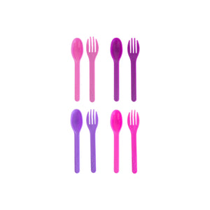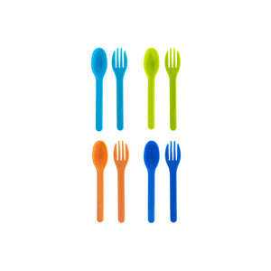 • Montiico Mini Cutlery Set (8pk) is a reusable set containing 4 pairs of forks and spoons in complimentary shades. They are designed to fit in little hands and many bento boxes, to help avoid sticky fingers and make eating lunch a breeze.