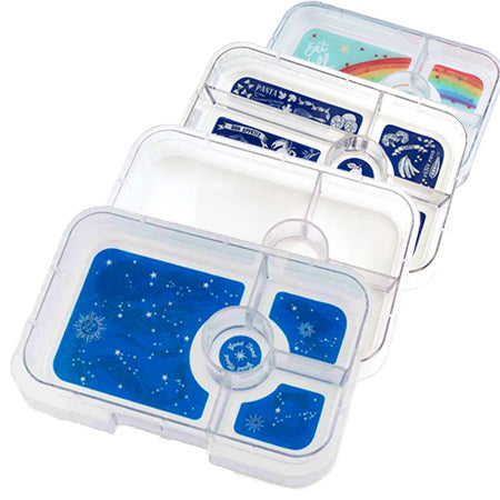 Yumbox Bento Lunch Boxes are inspired by the balanced, nutritious school lunches served in France. Yumbox's house a bento-like tray with one lid that seals all the compartments so you can pack a balanced meal that includes dry and wet food (yogurt, puree's, etc). This reusable bento box is a great way to switch from expensive prepackaged snacks wrapped in disposable plastic. The built-in portion control and illustrations make Yumbox Bentos more of an adventure to encourage healthy eating - are they are food safe, BPA-free and Phthalates-free). Choose from the 6-compartment Yumbox Original Lunch Box, Yumbox Panino Lunch Box, the larger Yumbox Tapas, or snack sized Yumbox MiniSnack.