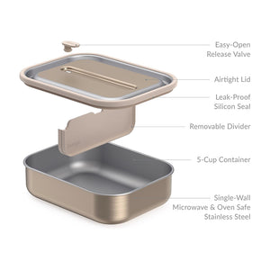 Materials - Container, Lid Seal & Removable Divider: Food-grade 18/8 stainless steel and silicone. Valve: Silicone. BPA Free and Phthalate Free and PVC Free