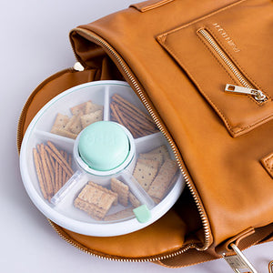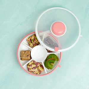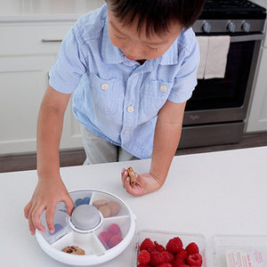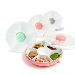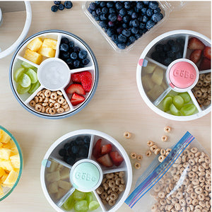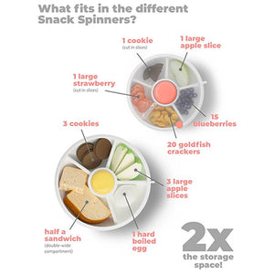 GoBe Snack Spinner (Small) this is the only spill-resistant snack container that allows your child to choose between five different snacks at once. With the push of a button, your child can jump from snack-to-snack, all while reducing spills and mess! More snacking variety for them, less mess for you.