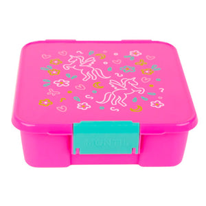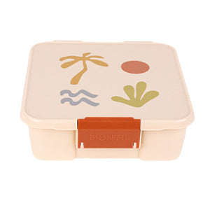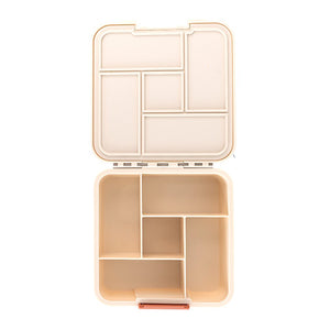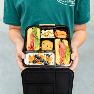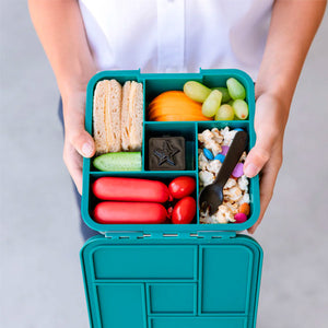 Montiico Bento Five is a five compartment, leak proof bento box designed for kids who prefer variety, and parents providing balanced meals with ease. Please note leak-proof compartments are leak-proof for wet foods (like thick yogurt, fruit puree) but not liquids like drinks/water/juice/watery dressings.